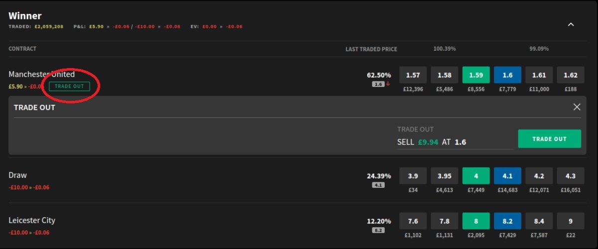 Hvis du ønsker å sikre gevinst så ofte som mulig så må man sikre minimalt med tap på smarkets med engang man har sikret gevinsten hos bookmakeren. Dette er heldigvis veldig enkelt å gjøre på de større markedene som premier league og la liga. Man tar ganske enkelt og trykker på “trade out”-knappen ved siden av eksponeringen man har. Dette alternativet funker ikke godt i kamper hvor en storfavoritt går i en ledelse, eller om det er 2-0 sent i kampen. Da faller oddsen ofte raskt ned til 1.01 og det vil være snakk om noen øre eller kroner i gevist.